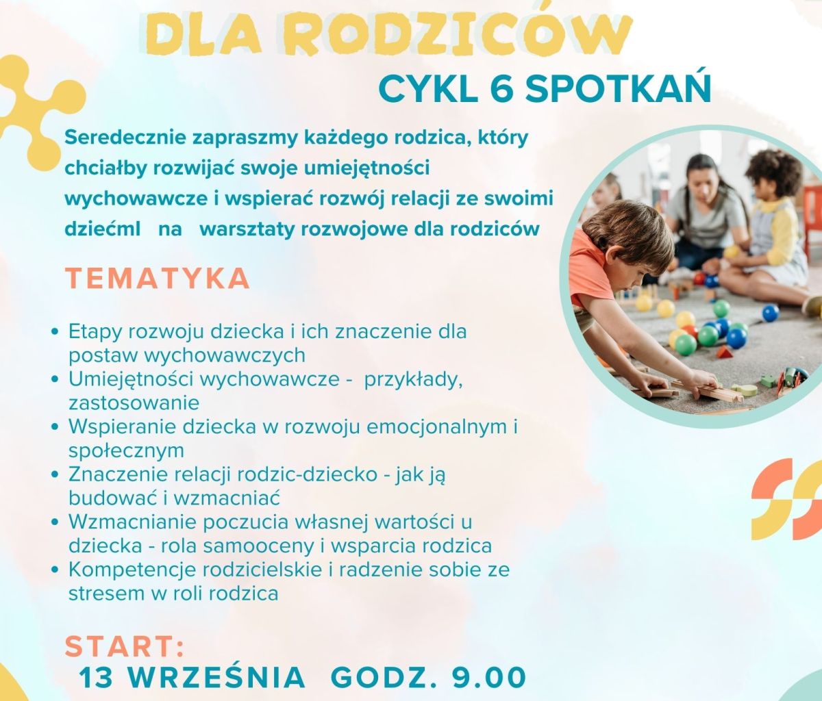 Serdecznie zapraszamy każdego rodzica, który chciałby rozwijać swoje umiejętności wychowawcze i wspierać rozwój relacji ze swoimi dziećmi na warsztaty rozwojowe dla rodziców. Szczegóły w załączniku