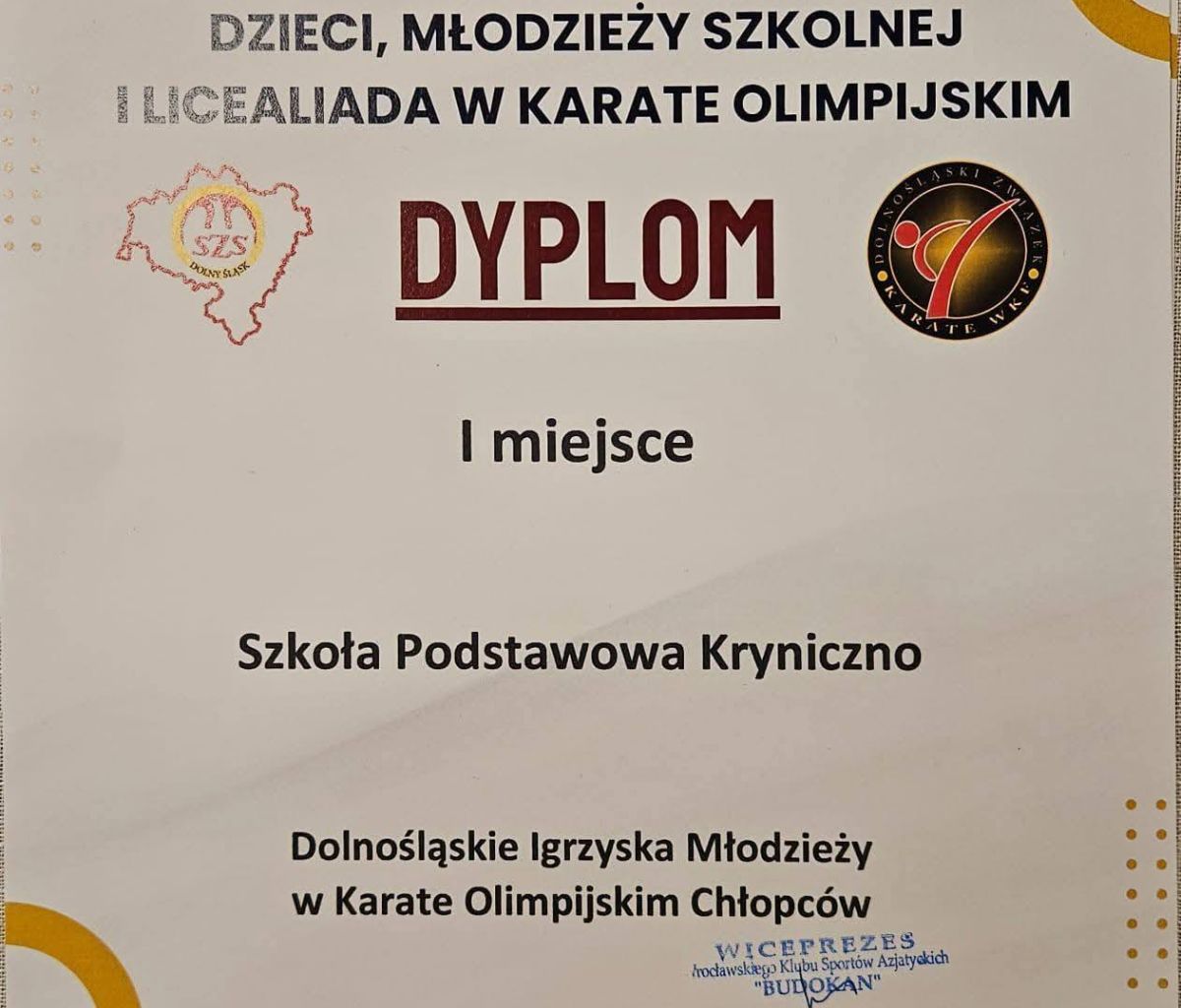Dnia 29.11.25. w Lutyni odbyły się Mistrzostwa Dolnego Śląska Igrzysk Dzieci I Młodzieży w Karate Olimpijskim. W tej formule zawodów karate dzieci i młodzież, trenujący na co dzień w DKK JINKAKU KANSEI, reprezentowali swoje szkoły. Świetny występ chłopców z naszej szkoly sprawił, że wywalczyli drużynowo I MIEJSCA na Dolnym Śląsku.